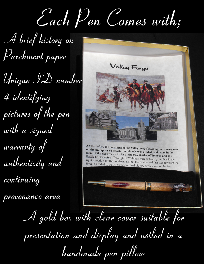 This William Penn Pen is made from a Box Elder that was growing on land that was part of the colonial country manor of Founding Father William Penn. It and a number of other trees was removed to make room for a boat launch and parking lot on the Delaware River. The color is all-natural though somewhat rare in the wood. The flame is most apparent when the pen is seen point up. CAUTION: the red color is photosensitive, and will fade to brown if exposed to strong light for extended periods.